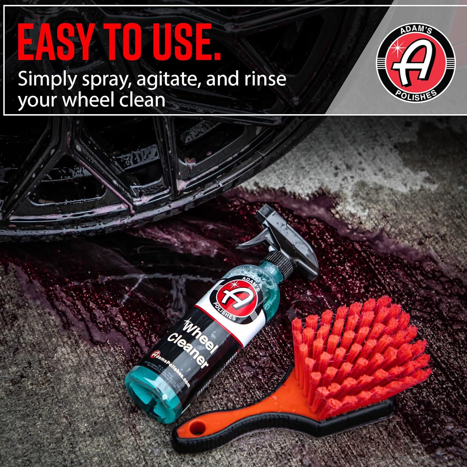 Simply spray on, allow the cleaner to activate, and then agitate using one of Adam's soft-bristle wheel brushes or other wheel cleaning tools (sold separately).