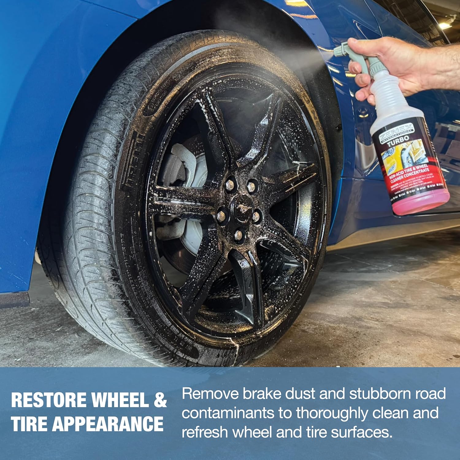 - REMOVES TOUGH GRIME & BRAKE DUST: Turbo Wheel Cleaner is specially formulated to penetrate and break down stubborn grime, grease, brake dust, and road debris on wheel and tire surfaces. It easily lifts away contaminants, leaving your wheels and tires looking spotless and rejuvenated with minimal effort.